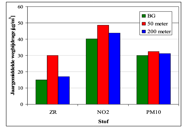 Figuur: Relatie tussen de concentratie PM10, NO 2 en Zwarte Rook in de buitenlucht en de afstand tot de snelweg. De met “BG” aangegeven concentratie is de achtergrondconcentratie. Figuur afkomstig uit dit rapport.